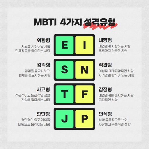 MBTI는 사람의 성향을 외향(E)과 내향(I), 직관(N)과 감각(S),